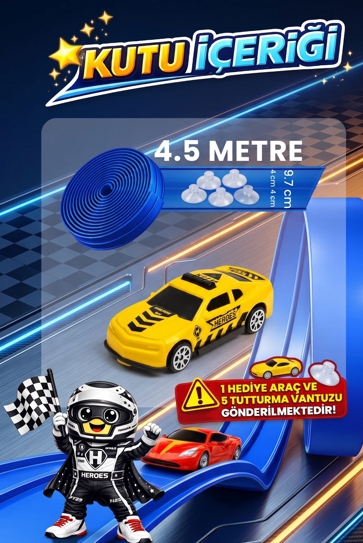 Sadece bir oyuncak değil, hemen başlayabileceğiniz eksiksiz bir macera! 4.5 metre uzunluğundaki pisti 5 adet vantuzla istediğiniz yere kolayca sabitleyin ve kutudan çıkan hediye aracınızla sınırları zorlayın. Oynamak için ihtiyacınız olan her şey bu kutunun içinde.